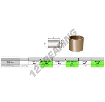 De Glijlager Bronze bekend als BAI44.45-57.15-38.1 Algemeen meet 44.45 mm in binnendiameter, 57.15 mm in buitendiameter en 38.1 mm lengte. Het is gemaakt in .