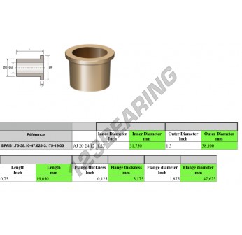 De Bronze Glijlager Met Kraag bekend als BFAI31.75-38.10-47.625-3.175-19.05 meet 31.75 mm in binnendiameter, 38.1 mm in buitendiameter en 19.05 mm lengte.