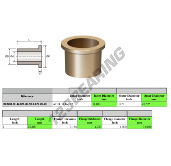 De Bronze Glijlager Met Kraag bekend als BFAI38.10-47.625-38.10-4.673-25.40 meet 38.1 mm in binnendiameter, 47.625 mm in buitendiameter en 25.4 mm lengte.