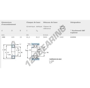 Het Kogellager, bekend als het 61836-SKF SKF, heeft een binnendiameter van 180 mm, een buitendiameter van 225 mm en een dikte van 22 mm.