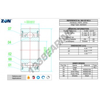 Het Kogellager, bekend als het 684-ZZ-W3.5-ZEN ZEN, heeft een binnendiameter van 4 mm, een buitendiameter van 9 mm en een dikte van 3.5 mm.