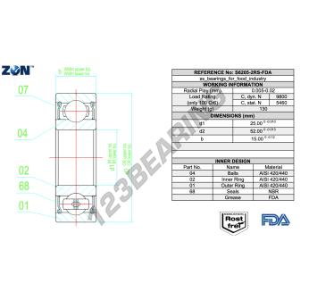 Het Kogellager, bekend als het S6205-2RS-FDA-AISI420-ZEN ZEN, heeft een binnendiameter van 25 mm, een buitendiameter van  52 mm en een dikte van 15 mm.