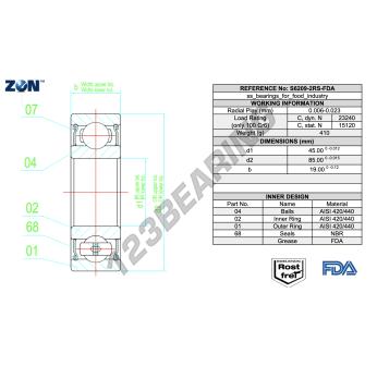 Het Kogellager, bekend als het S6209-2RS-FDA-AISI420-ZEN ZEN, heeft een binnendiameter van 45 mm, een buitendiameter van 85 mm en een dikte van 19 mm.