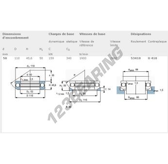Het Kogeltaatslager, bekend als het 53410-SKF SKF, heeft een binnendiameter van 50 mm, een buitendiameter van 110 mm en een dikte van 45.6 mm.