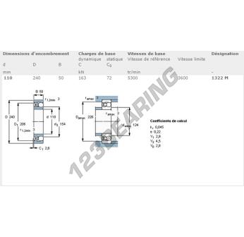 Het Zich Instellende Kogellager, bekend als het 1322-M-SKF SKF, heeft een binnendiameter van 110 mm, een buitendiameter van 240 mm en een dikte van 50 mm.