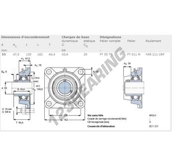 Het Lagerblok - 4 Bevestigingen bekend als FY55-TR-SKF SKF heeft een asdiameter van 55 mm en een centrumafstand van 130 mm. Dit onderdeelnummer is vervaardigd in gietijzer en het type bevestiging is .
