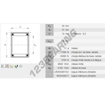 Het Naaldhulslager , bekend als het HK3016-B-INA INA, heeft een binnendiameter van 30 mm, een buitendiameter van 37 mm en een dikte van 16 mm.