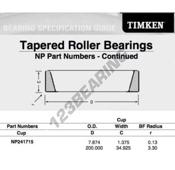 Het Kegellager Buitenring, bekend als het NP241715-TIMKEN TIMKEN, heeft een binnendiameter van mm, een buitendiameter van 200 mm en een dikte van 34.925 mm.