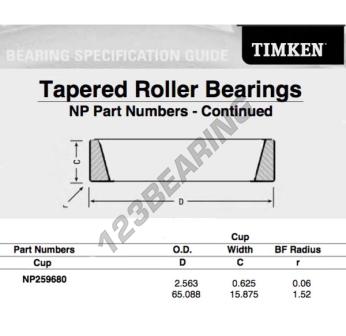 Het Kegellager Buitenring, bekend als het NP259680-TIMKEN TIMKEN, heeft een binnendiameter van mm, een buitendiameter van 65.088 mm en een dikte van 15.875 mm.