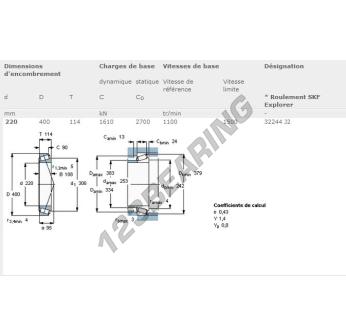 Het Kegellager, bekend als het 32244-J2-SKF SKF, heeft een binnendiameter van 220 mm, een buitendiameter van 400 mm en een dikte van 114 mm.