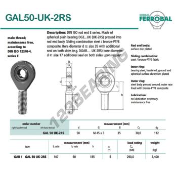 Het Ge Gewrichtslager bekend als GAL50-UK-2RS-DURBAL heeft een interne diameter van 50 mm, een externe diameter van 112 mm en een dikte van 35 mm.