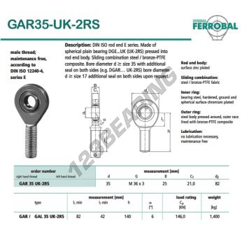 Het Ge Gewrichtslager bekend als GAR35-UK-2RS-DURBAL heeft een interne diameter van 35 mm, een externe diameter van 82 mm en een dikte van 25 mm.