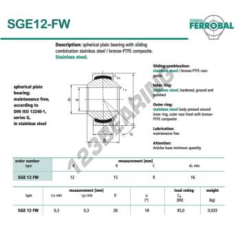 Het Geew Gewrichtslager bekend als SGE12-FW-DURBAL DURBAL heeft een interne diameter van 12 mm, een externe diameter van 26 mm en een dikte van 9 mm.
