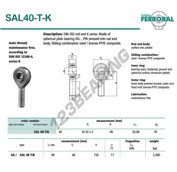 Het Stangkop Sa bekend als DSAL40-T-K-DURBAL DURBAL heeft een schroefsteek van , een binnendiameter van 40 mm, een buitendiameter van 91 mm en een dikte van 49 mm.
