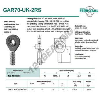 Het Stangkop Sa bekend als GAR70-UK-2RS-DURBAL DURBAL heeft een schroefsteek van , een binnendiameter van 70 mm, een buitendiameter van 160 mm en een dikte van 49 mm.