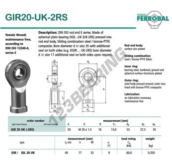 Het Si Stangkop bekend als GIR20-UK-2RS-DURBAL DURBAL heeft een interne diameter van 20 mm, een externe diameter van 53 mm en een dikte van 16 mm.